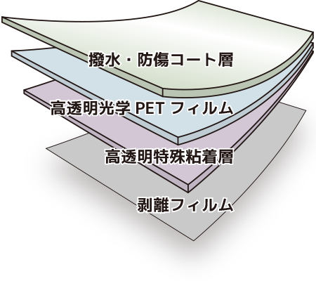 高い撥水性能を備えたトップ層を持たせることで降雨、降雪時に優れた日回を確保し運転に集中できます。また汚れの付着も減少しすることに加えて物理的なワイパーの使用量が減少することでフィルムそのものの耐用年数が長くなります。