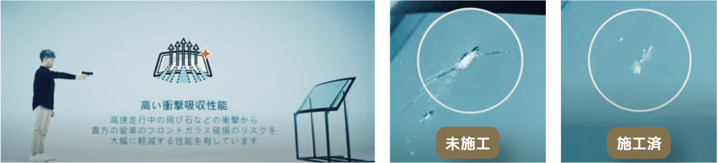 アーマーテックは高い透明度と高い保護性能を有する日本製フィルムです。国内屈指の技術を有する企業の協力を得て開発された125ミクロンの特殊構造フィルムがガラスを強固に保護します。超硬センターポンチを使用したテストでは、フィルムを貼っていないガラスは簡単に割れましたが、アーマーテックを施工したガラスはフィルムにわずかな打痕が残っただけで、ガラスは無傷という結果となりました。