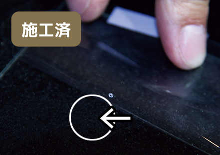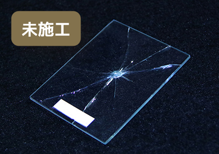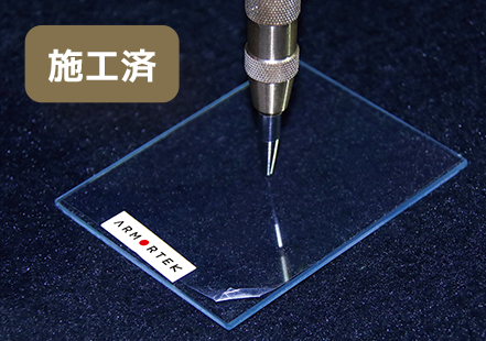 アーマーテックは高い透明度と高い保護性能を有する日本製フィルムです。国内屈指の技術を有する企業の協力を得て開発された125ミクロンの特殊構造フィルムがガラスを強固に保護します。超硬センターポンチを使用したテストでは、フィルムを貼っていないガラスは簡単に割れましたが、アーマーテックを施工したガラスはフィルムにわずかな打痕が残っただけで、ガラスは無傷という結果となりました。